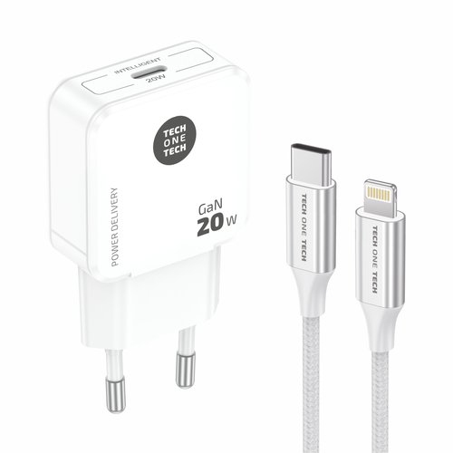 CARGADOR TECH-ONE-TECH PARED BLANCO + CABLE USB-C - LIGHTNING ALTO RENDIMIENTO 20W